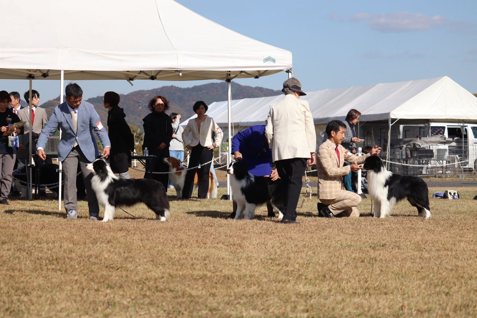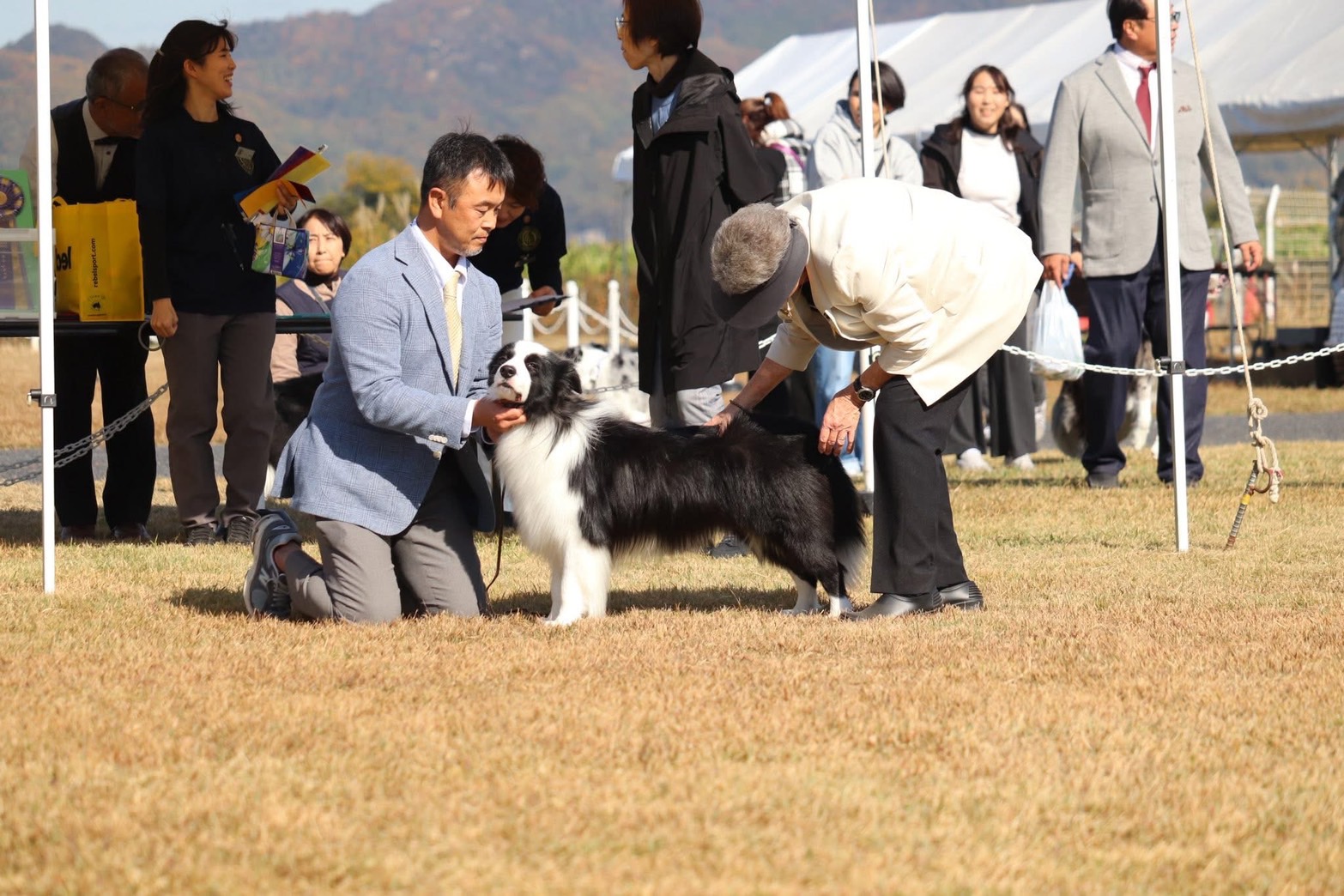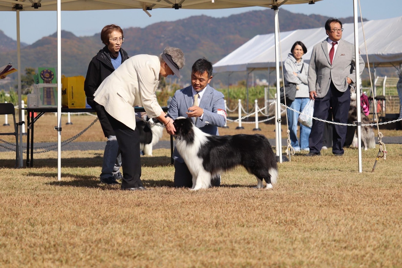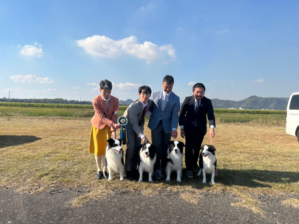 「岡山ボーダーコリークラブ展、ついに念願の大舞台に挑みました。審査員はオーストラリアからの名ジャッジ、Lynn Harrisonさんで、RUFUSにどんな評価が下されるのか胸が高鳴りました。今回は同胎のジルベスター君も参戦しており、クラスが重ならないよう調整。RUFUSは先週同様に格上のOPクラスに挑みましたが、このクラスは8頭ものエントリーで、なんとRUFUS以外は全てチャンピオン犬という超強豪揃い。そんな中、RUFUSはこれまでの経験を活かし堂々と振る舞い、見事に3席を獲得。1席には届かなかったものの、その勝者は後も勝ち続けて見事にオス部門トップに君臨していました。